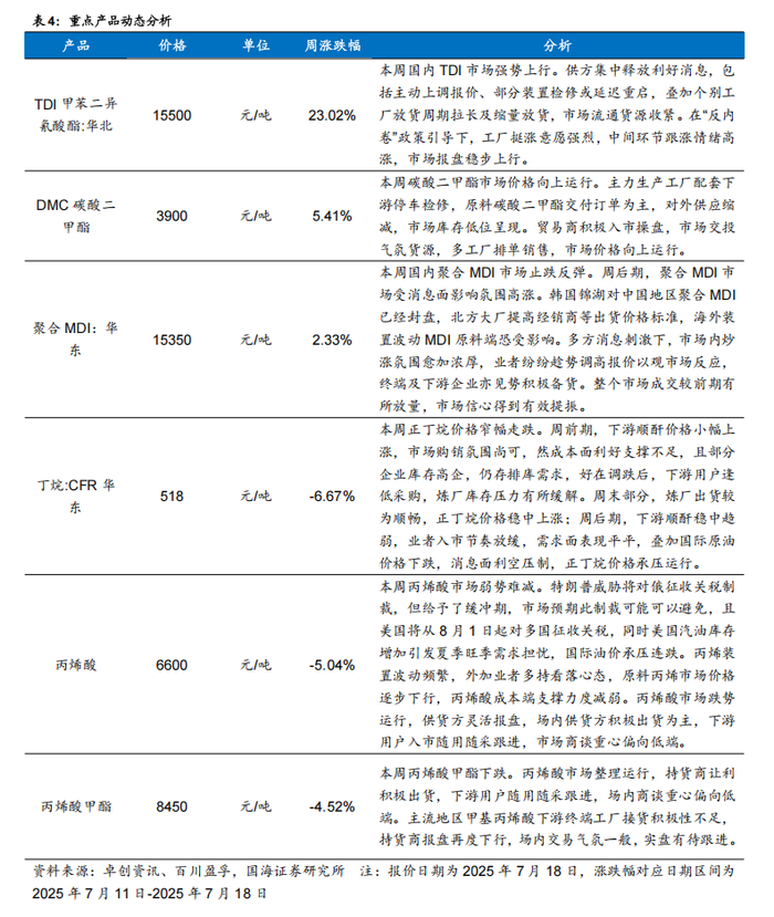 本周(2025年7月11日-2025年7月18日,下同)TDI甲苯二异氰酸酯:华北价格为15500元/吨,周环比+23.02%,供方集中释放利好消息,包括主动上调报价、部分装置检修或延迟重启,叠加个别工厂放货周期拉长及缩量放货,市场流通货源收紧。在“反内卷”政策引导下,工厂挺涨意愿强烈,中间环节跟涨情绪高涨,市场报盘稳步上行。本周DMC碳酸二甲酯价格为3900元/吨,周环比+5.41%。主力生产工厂配套下游停车检修,原料碳酸二甲酯交付订单为主,对外供应缩减,市场库存低位呈现。贸易商积极入市操盘,市场交投气氛货源,多工厂排单销售,市场价格向上运行。本周聚合MDI:华东价格为15350元/吨,周环比+2.33%,周后期,聚合MDI市场受消息面影响氛围高涨。韩国锦湖对中国地区聚合MDI已经封盘,北方大厂提高经销商等出货价格标准,海外装置波动MDI原料端恐受影响。多方消息刺激下,市场内炒涨氛围愈加浓厚,业者纷纷趁势调高报价以观市场反应,终端及下游企业亦见势积极备货。整个市场成交较前期有所放量,市场信心得到有效提振。