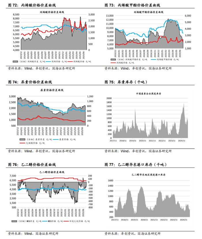 据百川盈孚,2025年7月18日乙二醇价格为4436元/吨,环比7月11日上升27元/吨。据卓创资讯,2025年7月18日尿素小颗粒价格为1740元/吨,环比7月11日下降60元/吨。
