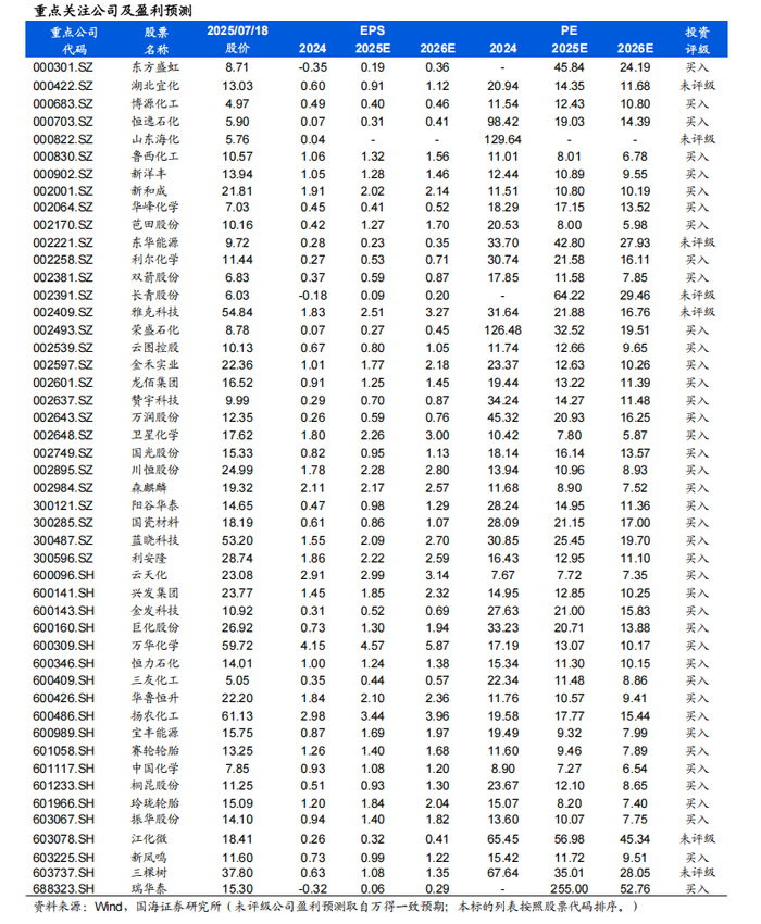 2025年7月1日,中央财经委第六次会议,要求“依法治理低价无序竞争、推动落后产能有序退出”,工信部总工程师谢少锋在7月18日国新办新闻发布会上表示,钢铁、有色金属、石化、建材等十大重点行业稳增长工作方案即将出台,工业和信息化部将推动重点行业着力调结构、优供给、淘汰落后产能。当前,在欧洲化工产能持续退出和中国化工新增产能扩张放缓的背景下,国内制造业反内卷行动将会进一步加速中国化工行业供给侧改革,优化竞争格局,国内化工龙头企业的业绩有望迎来重大拐点,重点关注弹性较大、质地优良的标的:聚氨酯行业(万华化学、沧州大化等)、民营炼化(恒力石化、荣盛石化、东方盛虹等)、低碳烯烃(卫星化学等)、煤化工(华鲁恒升、宝丰能源、鲁西化工等)、磷化工(云天化、湖北宜化、芭田股份、新洋丰、云图控股)、农药(扬农化工、兴发集团、新安股份等)、铬盐(振华股份等)。