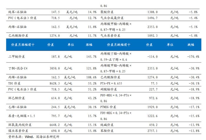 我们跟踪的171种产品的价格中,有38种上涨,占比22.22%,有52种产品下跌,占比30.41%。周涨幅前五的产品分别为:TDI甲苯二异氰酸酯:华北(23.02%)、现货价:天然气:亨利中心交割(6.26%)、DMC碳酸二甲酯(5.41%)、焦炭:山西(5.03%)、棉花:期货收盘价(4.47%)。周跌幅前五的产品分别为:液氯:国内(-21.78%)、盐酸:华北(-10%)、丁烷:CFR华东(-6.67%)、对硝基氯化苯:安徽(-6.12%)、丙烯酸(-5.04%)。