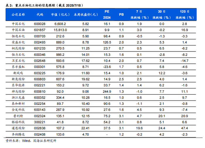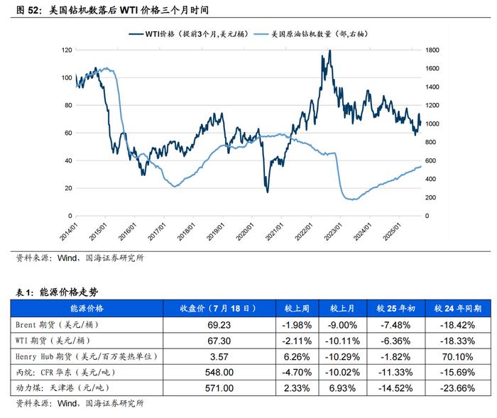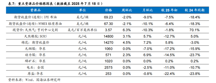 据Wind,截至7月18日,Brent和WTI期货价格分别收于69.23和67.3美元/桶,周环比-1.98%和-2.11%。