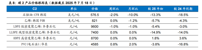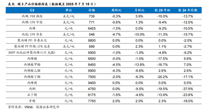 本周丁烷:CFR华东价格为518元/吨,周环比-6.67%。周前期,下游顺酐价格小幅上涨,市场购销氛围尚可,然成本面利好支撑不足,且部分企业库存高企,仍存排库需求,好在调跌后,下游用户逢低采购,炼厂库存压力有所缓解。周末部分,炼厂出货较为顺畅,正丁烷价格稳中上涨;周后期,下游顺酐稳中趋弱,业者入市节奏放缓,需求面表现平平,叠加国际原油价格下跌,消息面利空压制,正丁烷价格承压运行。本周丙烯酸价格为6600元/吨,周环比-5.04%。特朗普威胁将对俄征收关税制裁,但给予了缓冲期,市场预期此制裁可能可以避免,且美国将从8月1日起对多国征收关税,同时美国汽油库存增加引发夏季旺季需求担忧,国际油价承压连跌。丙烯装置波动频繁,外加业者多持看落心态,原料丙烯市场价格逐步下行,丙烯酸成本端支撑力度减弱。丙烯酸市场跌势运行,供货方灵活报盘,场内供货方积极出货为主,下游用户入市随用随采跟进,市场商谈重心偏向低端。本周丙烯酸甲酯价格为8450美元/吨,周环比-4.52%。丙烯酸市场整理运行,持货商让利积极出货,下游用户随用随采跟进,场内商谈重心偏向低端。主流地区甲基丙烯酸下游终端工厂接货积极性不足,持货商报盘再度下行,场内交易气氛一般,实盘有待跟进。