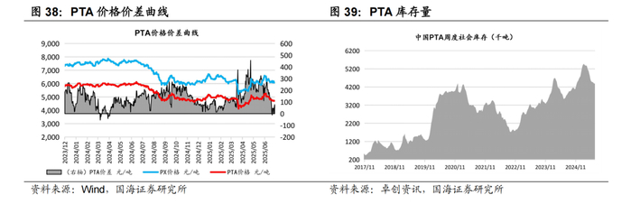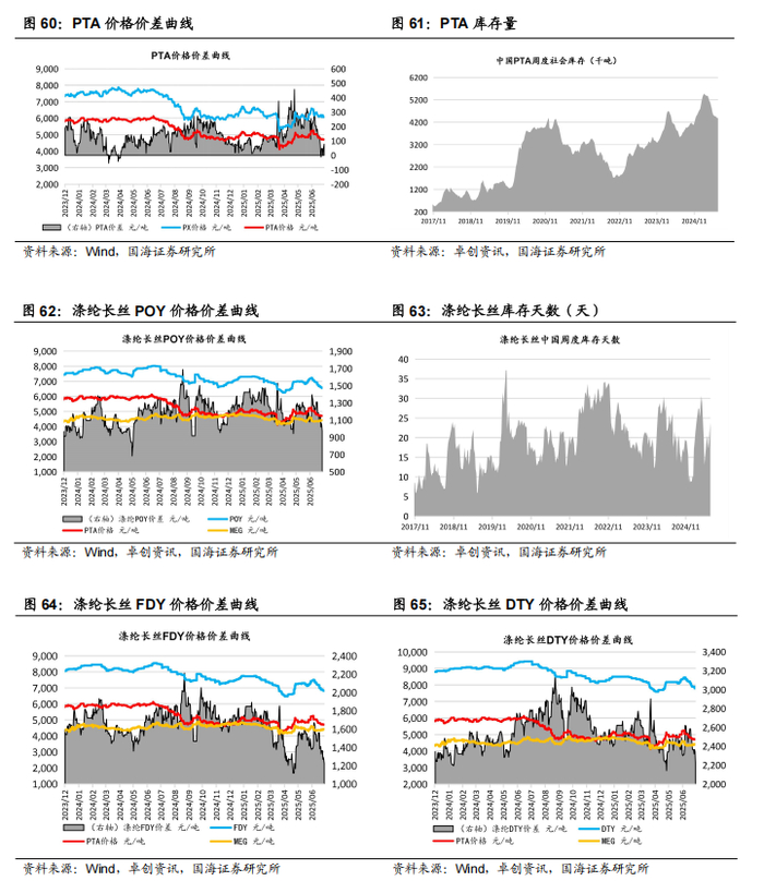 据Wind和卓创资讯,2025年7月17日涤纶长丝库存天数为26.5天,较7月10日上涨2.8天。2025年7月18日,PTA社会库存为444.2万吨,较7月11日上涨4.5万吨。涤纶长丝POY价格为6525元/吨,较7月11日下降125元/吨。PTA 价格为4790元/吨,较7月11日下降80元/吨。