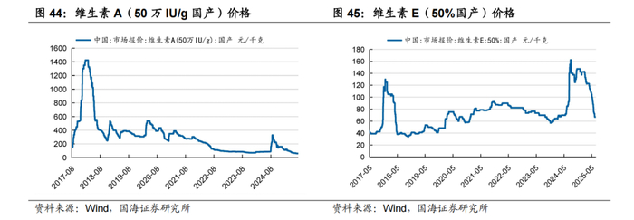 据Wind,2025年7月18日,维生素A价格为62.00元/千克,环比7月11日持平;维生素E价格为67.00元/千克,环比7月11日持平。