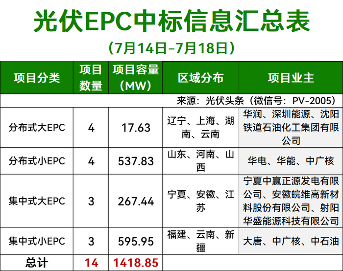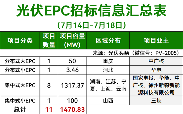 光伏头条对7月第1周(7月14日-7月18日)光伏EPC招/中标项目公开信息不完全统计,本周招标规模合计1470.83MW,中标规模合计1418.85MW,招中标规模合计2889.68MW。