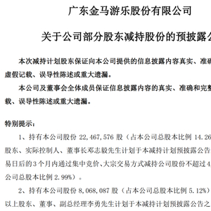 7月20日晚间,金马游乐公告称,公司实控人、董事长邓志毅计划减持公司股份不超过471.2万股(占公司总股本的2.99%);公司董事、副总经理李勇计划减持公司股份不超过201.7万股(占公司总股本的1.28%);公司副总经理林泽钊计划减持公司股份不超过50.82万股(占公司总股本的0.32%);公司董事、总经理高庆斌计划减持公司股份不超过37.28万股(占公司总股本的0.24%)。上述四名实控人和高管拟合计减持不超过4.83%公司股份。