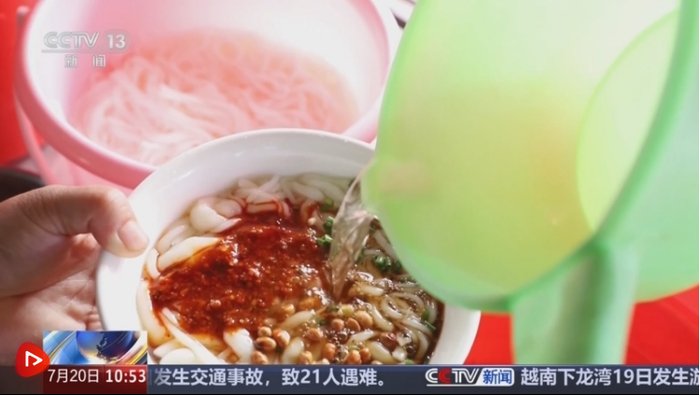 炉火持续加热时,要不停搅拌锅中的米浆,这个环节至少要坚持半小时。最后,滚烫的米浆通过特制漏斗淋入凉水中,瞬间凝固成细条状,在水中摆动时像一群游动的小虾。吃的时候舀入冰镇酸水,淋上秘制辣椒,撒把炒得香脆的黄豆,一碗消暑佳品就成了。