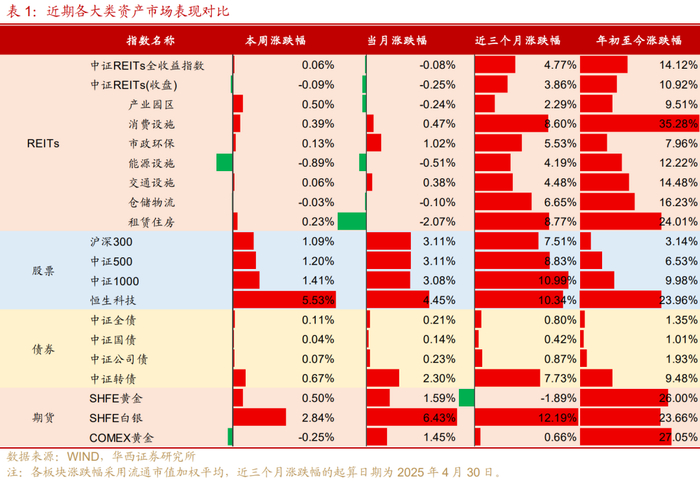 大类资产角度,随着市场风险偏好提升,7月以来REITs涨幅不及权益和转债。本周权益市场仍然领涨,沪深300、中证500、中证1000、恒生科技和中证转债分别上涨1.09%、1.20%、1.41%、5.53%和0.67%,均跑赢REITs,沪金、沪银也分别取得0.50%、2.84%的涨幅。