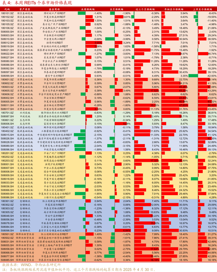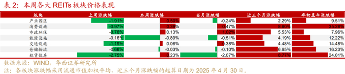 部分产业园区项目本周表现亮眼。招商科创、中金湖北科投光谷、华夏和达高科和华夏合肥高新分别上涨3.05%、2.08%、1.55%和1.31%,带动产业园区板块本周领涨。从各项目的2季度经营情况来看,各项目产业园市场仍普遍承压,各区域市场内存量以及新增研发办公楼的供给也对产业园区形成竞争,“以价换量”可能仍是园区吸引租户的主要手段。可重点关注出租率表现相对较好或偏生产型的产业园区个券,如广发成都高投产业园、博时蛇口产园、国泰君安临港创新产业园和东久新经济。