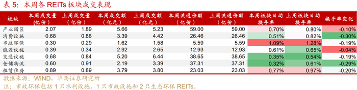 分板块来看,本周日均换手率靠前的是市政环保(1.09%)、租赁住房(0.77%)和产业园区(0.70%)。各板块换手率较上周均继续下滑,其中消费设施较上周减少了0.30pct。仓储物流、交通设施板块成交活跃度仍然垫底。
