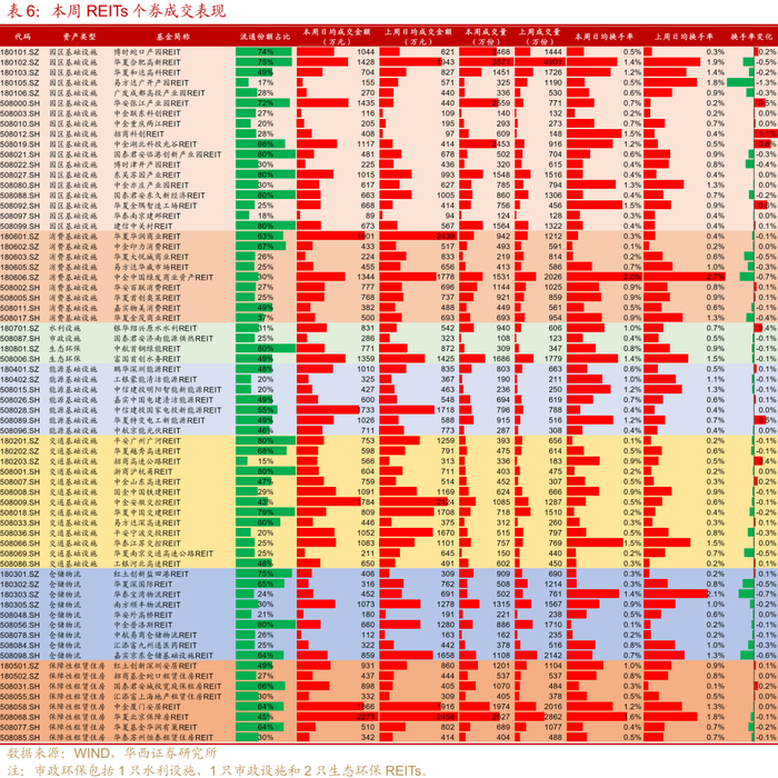 个券层面,本周交易活跃度前三的分别是中金中国绿发商业资产REIT、华夏北京保障房REIT和华泰江苏交控REIT,日均换手率分别为2.04%、1.62%和1.52%,其中绿发商业主要是近期新上市项目热度较高所致,三只REITs价格涨跌幅分别为-0.88%、+0.77%和+0.50%。