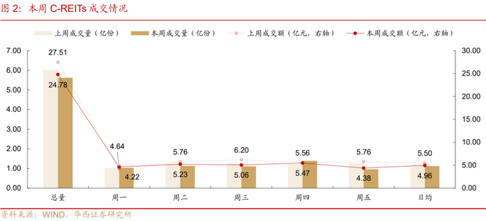 本周市场整体成交活跃度继续下降,日均成交额4.96亿元、日均成交量1.12亿份、日均换手率0.55%,环比分别下降9.92%、6.64%、0.04pct。