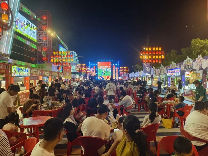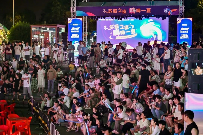 无锡招商城夏日星空夜市则是化身激情澎湃的足球海洋,现场架设户外大屏,向热情如火的球迷们实时直播赛事。上百家摊位灯火通明,滋滋作响的烧烤架升腾起诱人烟雾,海鲜的鲜香与冰饮的清凉气息在热浪中交织,服饰百货区、足球互动区更添繁华。广场中部设置了150套桌椅,赛前已经提前挂起了足球气球,不少球迷吹起助威喇叭,奏出“苏超”的激昂序曲。