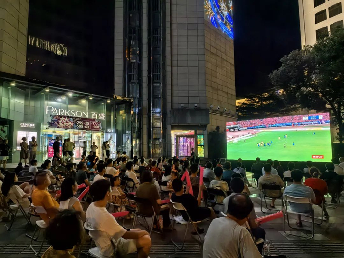 7月20日晚,苏超联赛无锡对阵淮安的比赛期间,无锡苏宁商场二楼设置的大屏实时转播赛事,吸引了众多市民驻足观看。
