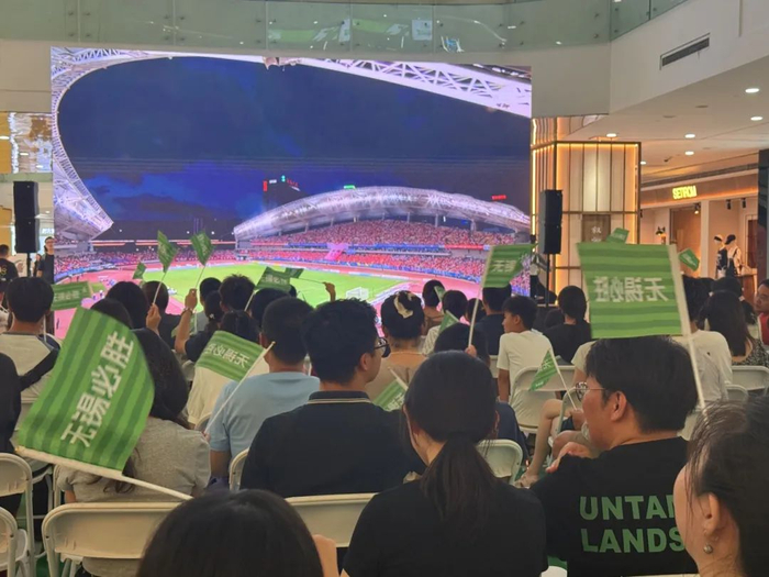 溪南公馆人潮涌动,露天广场上的高清直播大屏一亮,观赛的氛围直接拉满。球迷们聚集在大屏前,一起高喊“无锡,加油!”随着比赛进程,欢呼声、助威声此起彼伏,一起把气氛推到顶。