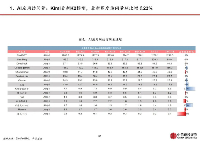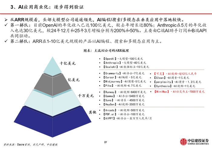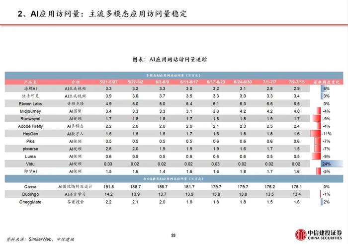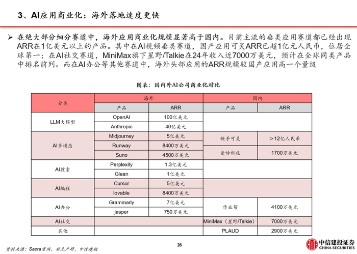 全球AI应用商业化落地加速。虽然目前除了ChatGPT(App月活6.6亿)以外,还没有出现能和X、Facebook、微信等移动互联网爆款产品同一用户规模量级的原生AI应用,但在编程、搜索、视频生成等多个垂类场景,AI应用的渗透率提升与商业化进展快。