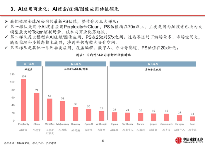AI搜索:Gemini模型4月月均Token调用量超480万亿,同比增长50倍。我们测算AI搜索贡献谷歌超80%的调用量。在全球AI公司估值中,Perplexity和Glean的PS估值均在70x以上,全球领先。