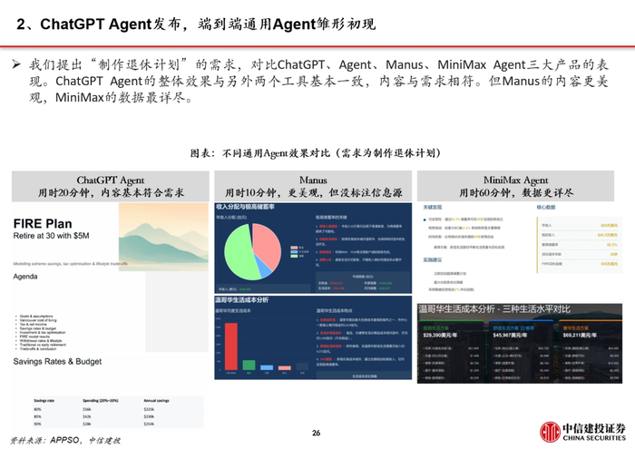 效果与其他国产通用Agent类似。我们对比ChatGPT Agent、Manus、MiniMax Agent制作养老计划PPT的效果。三个产品的内容均基本满足需求,ChatGPT Agent的整个运作过程均在ChatGPT窗口完成,内容旁也提供了资料来源索引,使用门槛较低。Manus的PPT更美观、制作时间最快(仅10分钟)。MiniMax的数据最为详实充分。
