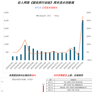 周五《超自然行动组》日流水创新高(根据点点数据,预估2000w量级)。上一次流水新高是7月4日,本周五流水约是7月4日的2.8倍,主要是本周与叶罗丽IP联动推出皮肤。本周买量投放也继续加大,周度投放计划数约为23万,环比上周增长约80%。