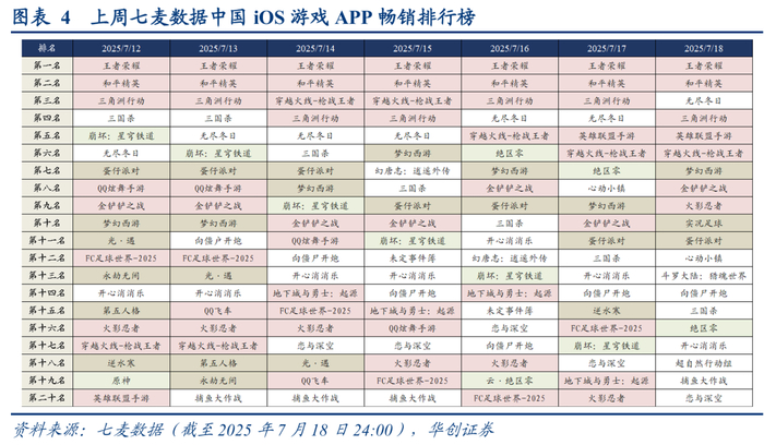 根据七麦数据,2025年7月12日至2025年7月18日游戏iOS畅销排行显示,腾讯系产品优势地位显著,《王者荣耀》、《和平精英》、《三角洲行动》基本位居前四,《金铲铲之战》稳居中游;网易系产品方面,《蛋仔派对》、《梦幻西游》排名位居中上位置;其他厂商方面,《无尽冬日》排名靠前,《三国杀》、《崩坏·星穹铁道》表现分化,《向僵尸开炮》、《开心消消乐》稳居中下游。