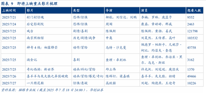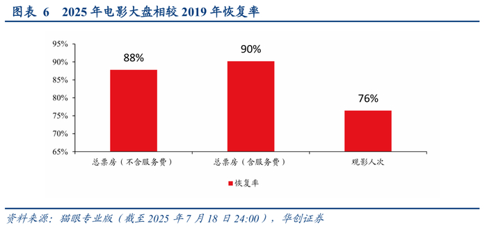 根据猫眼专业版,截至7月18日,2025年电影大盘实现票房(不含服务费)279.06亿元,观影总人次6.84亿人;2019年同期电影票房为317.85亿,观影总人次为8.95亿人。复苏节奏看,票房大盘已恢复约88%,观影人次已恢复约76%。