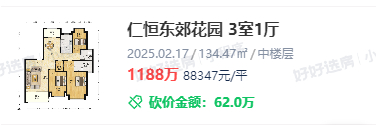 建面约134.47㎡房源,成交总价约1188万,折合单价约88347元/㎡;