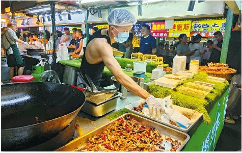在环联夜市,像刘雪峰这样的金蝉摊有多家,家家都在忙着招呼客人。