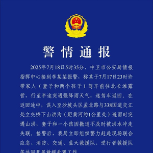据通报,2025年7月18日5时35分,中卫市公安局情报指挥中心接到李某某报警,称其于7月17日23时许带家人(妻子和两个孩子)驾车前往北长滩露营,行至半途突遇强降雨天气,遂驾车返回。在返回途中,误入沙坡头区孟北路与338国道交会处立交桥下山洪沟(距黄河约1公里处),避雨时突遇山洪,妻子和一小孩因撤退不及时被洪水冲走失联。