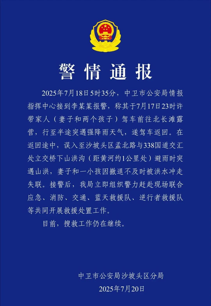 7月20日下午5时许,宁夏中卫市沙坡头警方通报“有人报警称妻子和小孩被洪水冲走失联”。