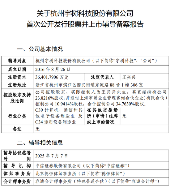 7月18日,中国证监会官网显示,杭州宇树科技股份有限公司(下称“宇树科技”或“公司”)开启上市辅导,辅导机构为中信证券。这表明,公司正式启动IPO。