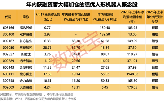 结合业绩来看,年内获融资客加仓幅度超过10%,且2025年半年报业绩预喜(略增、扭亏)的人形机器人概念股有10只,含2只年内新进成为融资融券的标的,分别为福达股份、双林股份。