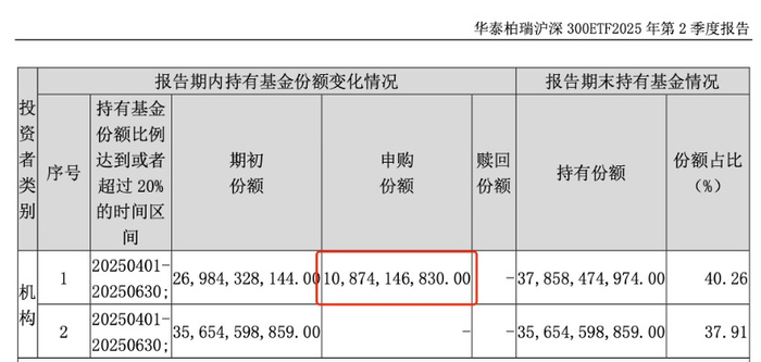 华泰柏瑞披露了旗下沪深300ETF二季报显示,“机构1”在今年二季度大手笔申购了该ETF108.74亿份,对照2024年报十大持有人期初份额来看,“机构1”为中央汇金资管公司,中央汇金出手百亿份额,以4月7日后7个交易日均价3.7元估算,此次买入金额高达400亿元。从申购份额来看,中央汇金买入该ETF最多。