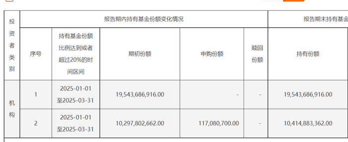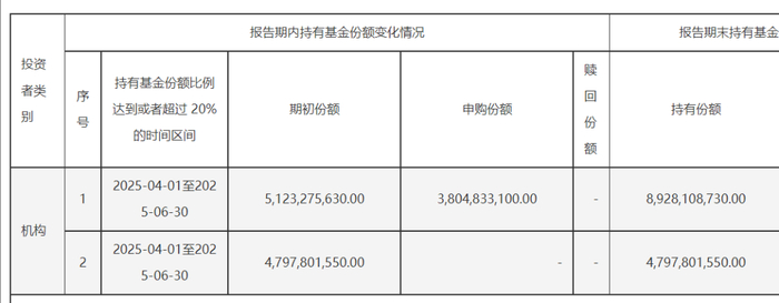 嘉实沪深300ETF发布的2025年二季报显示,截至一季度末,“机构2”持有该ETF104.15亿份,二季度“机构2”增持该ETF55.4亿份,持有份额增至159.55亿份。根据该ETF披露的2024年年报和2025年一季报,可以推算出“机构2”即为中央汇金资产管理有限责任公司,“机构1”则是中央汇金投资有限责任公司。