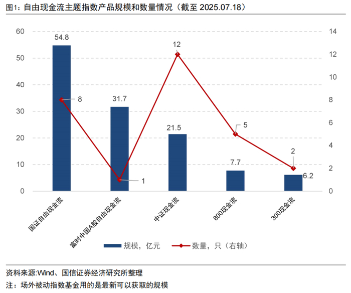 自2月以来首批自由现金流ETF上市以来,自由现金流策略不断被基金公司关注与布局。截至2025年7月18日,国内自由现金流主题指数产品规模与数量持续扩张,如图1所示,自由现金流主题指数产品总规模超100亿元,达121.85亿元,数量已达28只。其中跟踪国证自由现金流指数的被动产品规模最多,已达54.8亿元,数量8只(2只为场外被动指数产品);其次是跟踪富时中国A股自由现金流聚焦指数的产品为1只ETF,规模为31.7亿元;排在第三的是跟踪中证现金流指数的被动产品,均为ETF,合计规模达21.5亿元,数量12只。