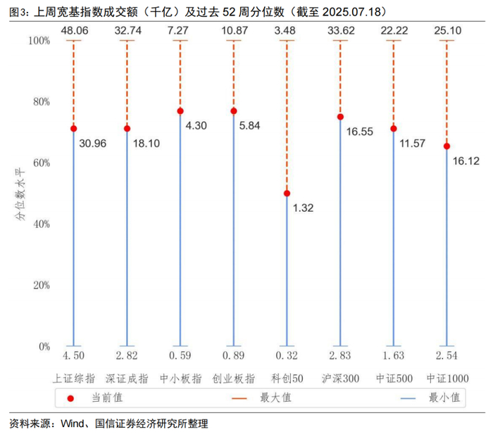 从成交额来看,上周主要宽基指数成交额均有所上升,在过去52周的样本期内,主要宽基指数均位于50%-80%的历史分位水平。