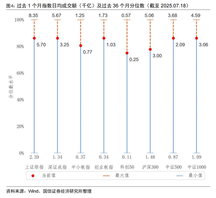 按月度来看,过去一个月主要宽基指数的日均成交额均有所上升,主要宽基指数均位于过去36个月75%-90%的历史分位水平。