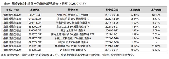 统计指数增强基金相对基准的超额收益和量化对冲型基金的收益情况,新成立基金在6个月建仓期满之后才参与统计。上周指数增强基金超额收益中位数为0.01%,量化对冲型基金收益中位数为0.09%。今年以来,指数增强基金超额中位数为3.35%,量化对冲型基金收益中位数为0.66%。