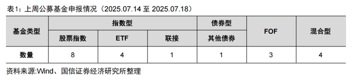 上周共上报26只基金,较上上周申报数量有所减少。申报的产品包括3只FOF,西部利得创业板综合ETF、平安国证创新药ETF、南方国证港股通创新药ETF、汇添富恒指港股通ETF等。