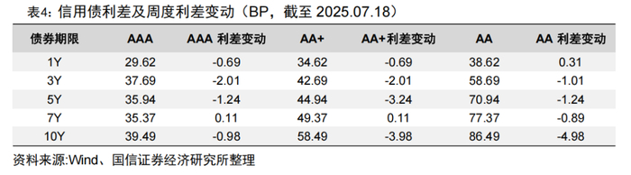 信用利差方面,3年期、5年期和10年期不同评级的信用债利差均有所下行。