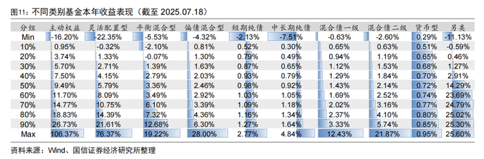 今年以来另类基金业绩表现最优,中位数收益为14.29%,主动权益型、灵活配置型和平衡混合型基金的中位数收益分别为9.49%、5.79%、3.36%。