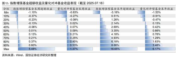 上周指数增强基金超额收益中位数为0.01%,量化对冲型基金收益中位数为0.09%。今年以来,指数增强基金超额中位数为3.35%,量化对冲型基金收益中位数为0.66%。