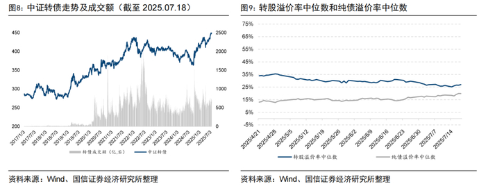 上周中证转债指数上涨0.67%,累计成交3533亿元,较前一周增加128亿元。截至上周五,可转债市场转股溢价率中位数为26.96%,较前一周增加0.68%,纯债溢价率中位数为19.87%,较前一周增加1.17%。