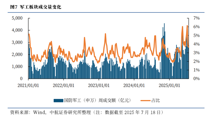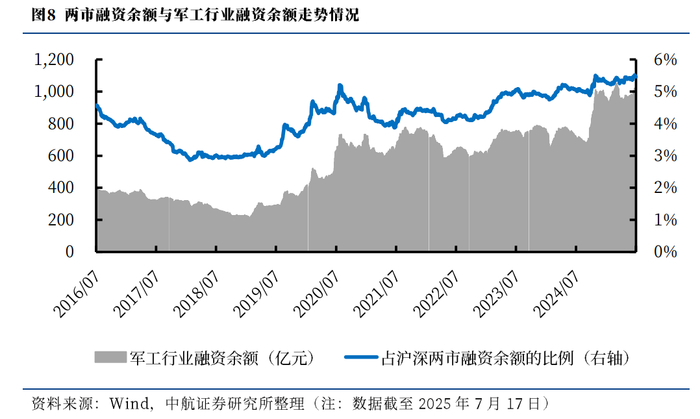 截至2025年7月17日,军工行业的融资余额合计1029.10亿元,比上周环比上涨1.01%,占两市融资余额比例为5.46%。