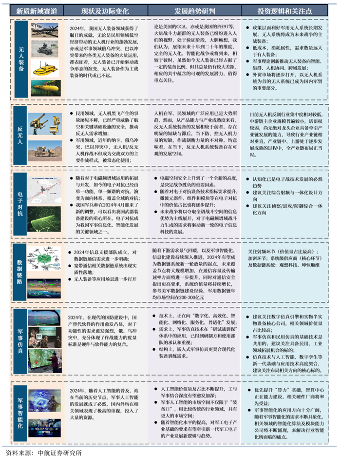 3、关注无人装备、卫星互联网、电子对抗等新质新域的投资机会;