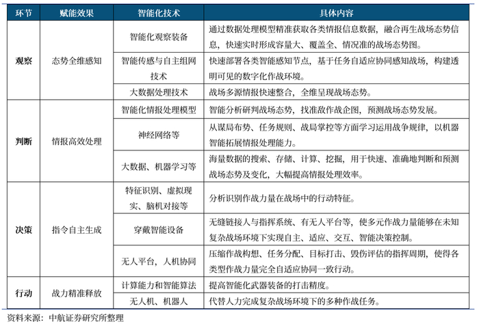 军事智能化是信息化的延伸和升级,赋能各作战环节流程(即“OODA环”),从而实现整体作战效果升级。信息化指充分利用现代信息技术开发利用信息资源,促进信息交流和知识共享,推动军事、经济、社会发展转型的历史进程。信息化具有提高军事效能的作用,可通过数字化、网络化、一体化、作战云和数字孪生等实现多种平台跨域联合作战。而智能化则更进一步,在信息互通互融的基础上赋予系统对客观事物进行合理分析,判断及有效地处理、行动的综合能力,是信息化垂直向下的深度融合。以人工智能为例,其三大要素为数据、算法、算力,数据是大数据;算法是机器学习、深度学习、强化学习;算力是超级运算、云计算和未来的量子计算,均需要以充分的信息化为基础。基于技术层面的支撑和应用层面的实现,军事智能化最终形成的作战效果是一个以信息为主导,具备战场感知、信息传输、处理决策、指挥控制、任务执行、效果评估等作战能力的闭环过程。20世纪70年代,美军提出了“OODA”理论,即观察、判断、决策和行动。随着以人工智能为首的新兴技术加速向军事领域转移,智能化赋能“OODA”循环,提高全面性、精准性、一致性,实现作战效果升级。