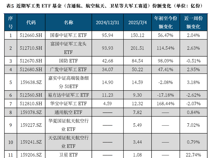 表5 近期军工类ETF基金(含通航、航空航天、卫星等大军工赛道)份额变化(单位:亿份)
