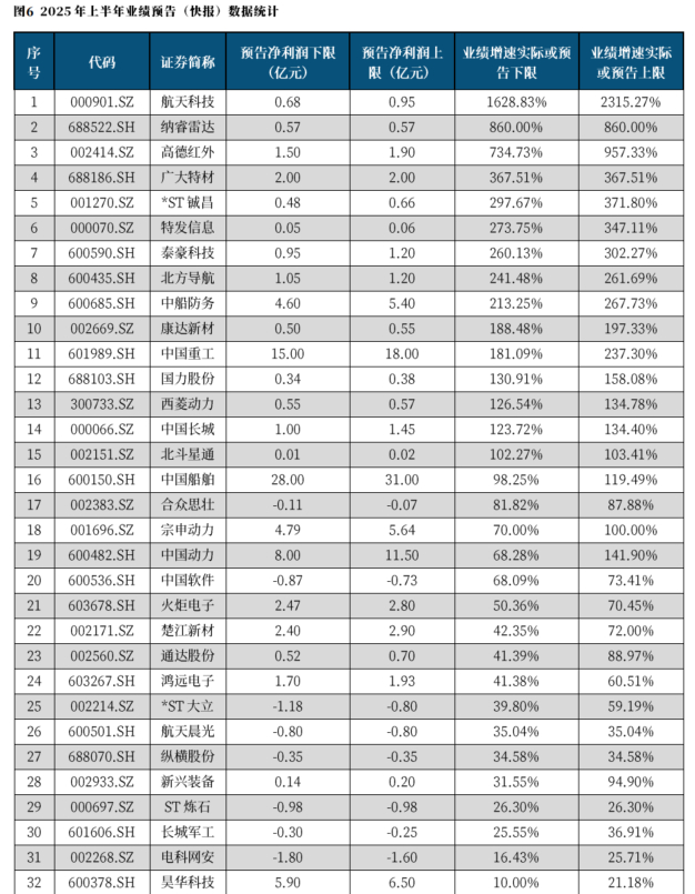 截至2025年7月18日,共计61家企业公布2025年半年度业绩预告、快报,其中33家业绩预增,28家业绩预减。涨幅居前的上市公司主要围绕船舶、防务、航天等产业链。如净利润方面,航天科技预增长1628.83%-2315.27%,纳睿雷达预增长860.00%,高德红外预增长734.73%-957.33%,广大特材预增长367.51%,北方导航预增长241.48%-261.69%,中国重工预增长181.09%-237.30%等。