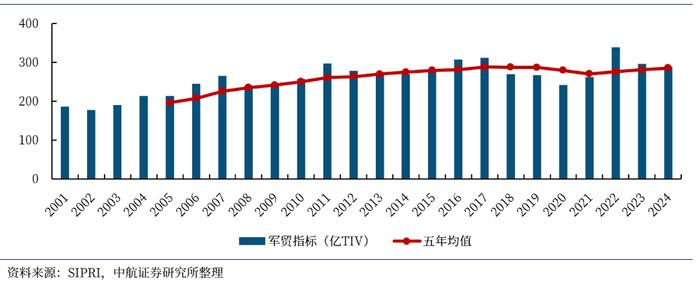 2024年,SIPRI全球军贸指标略有下降,但是军贸热度仍然维持在高位,根据SIPRI数据,单年度看,全球军贸指标在2022年高速增长,创下21世纪以来新高,但由于军贸订单签订与交付存在时间差,以及近年来二手装备占比提升的影响,2023年全球军贸指标同比下降12.37%,2024年再次同比下降2.51%,而2020-2024年军贸指标的五年均值则依旧实现了同比1.56%的增长。基本符合历史上军贸指标存在周期性波动,但整体重心上行趋势不变的特点。