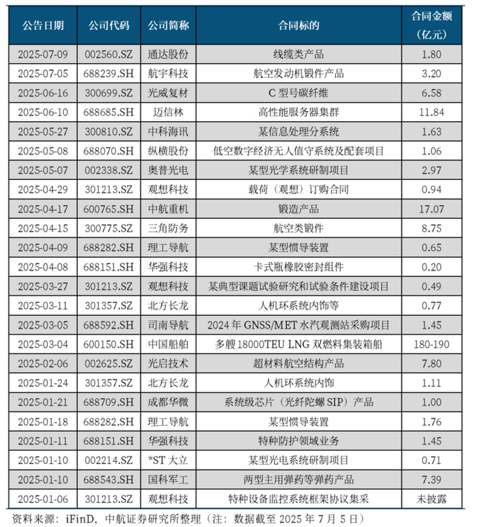 与此同时,2025年以来,多家航空航天领域中上游上市公司公告了重大合同或中标通知书,具体如下表所示。