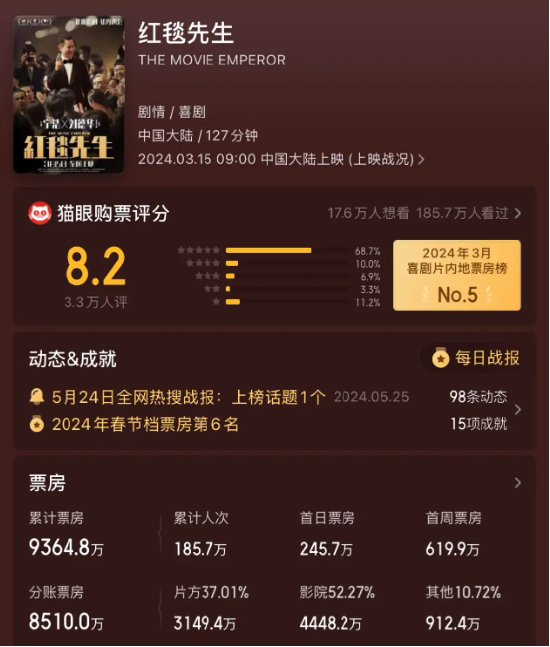 成立10年间,欢喜传媒仅在2019年和2023年实现盈利,盈利年份屈指可数,尤其是2024年,更是被业内称为欢喜传媒的“至暗时刻”。2024年,宁浩导演,刘德华主演的《红毯先生》在春节档上映,但因票房不佳后遭撤档,改档重映最终票房仍不足1亿元。